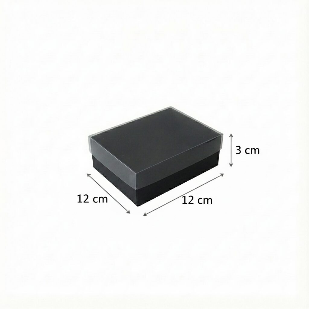 12x12x3 siyah asetat kapaklı takı kutusu, takı ve aksesuarların şık ve profesyonel şekilde sunulması için üretilmiş premium bir kutu modelidir. Gövdesi 350g Amerikan Bristol kağıttan üretilmiş olup şeffaf asetat kapağı ile ürünün içi net şekilde görünür. E-ticaret, butik ve mağaza satıcıları için ideal paketleme çözümüdür