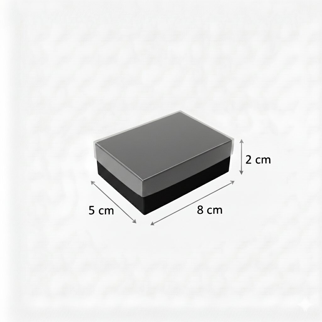 5x8x2 Siyah asetat kapaklı takı kutusu, özellikle takı, kolye, yüzük, bileklik, küpe, kolye ucu ve küçük aksesuarların şık ve güvenli bir şekilde sunulması için tasarlanmış özel bir üründür. Hem butik işletmelerin hem de e-ticaret satıcılarının profesyonel bir paketleme deneyimi sunmasını sağlayan bu kutu, zarif görünümü ve sağlam yapısıyla ürünleri değerli ve özel gösterir. Kutunun gövdesi 350g Amerikan Bristol kağıttan üretilmiş olup asetat (şeffaf kapak) tasarımı sayesinde ürünün içi dışarıdan net şekilde görünür. Bu sayede hem satış öncesi hem de hediye sunumlarında profesyonel bir izlenim oluşturur.